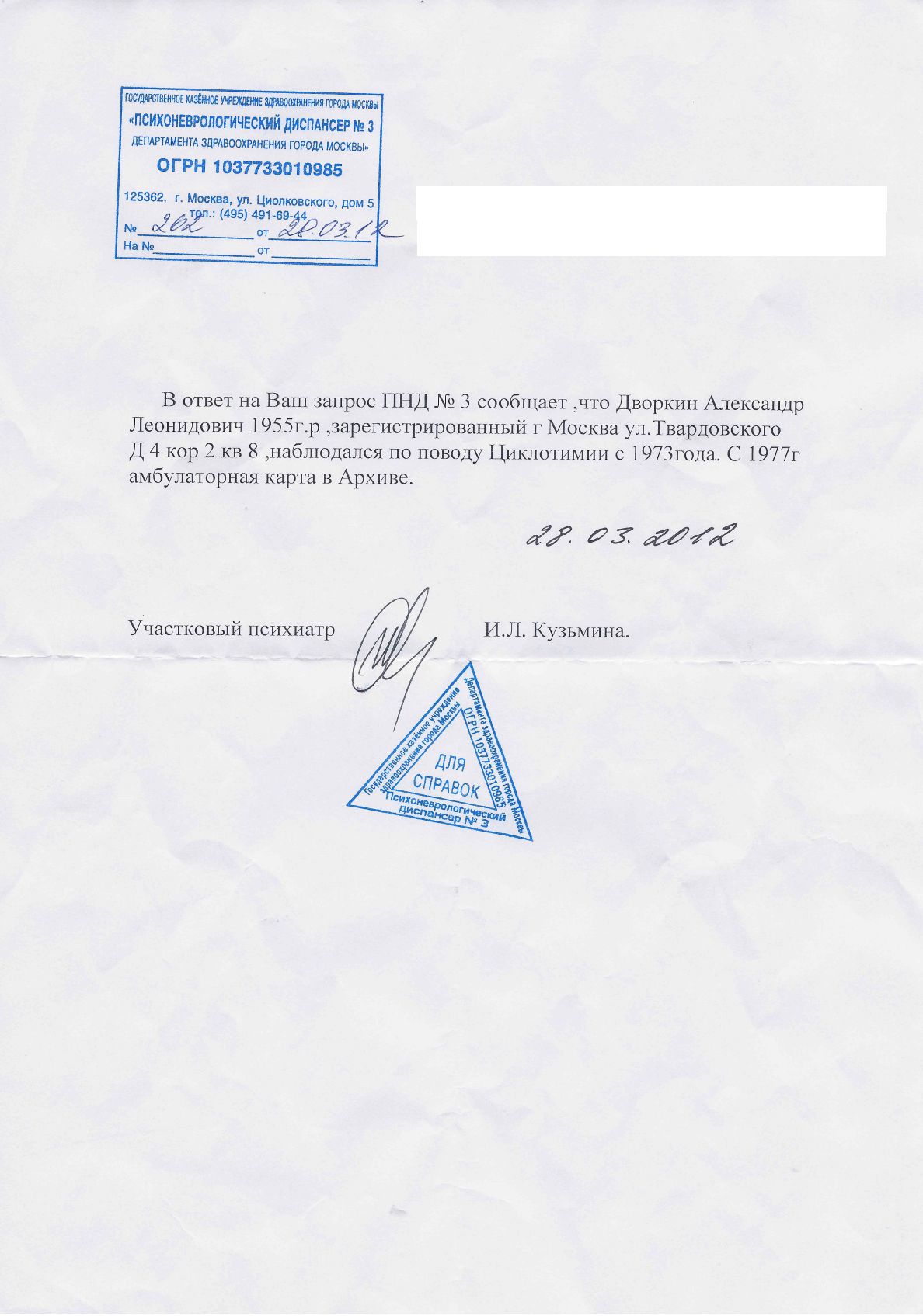 Будто в ответ на эти слова, в «Московской правде» сообщалось: «Кроме того, в распоряжение редакции получен оригинал официального ответа, который ПНД №3 дал еще в 2012 году — т. е. за два года до публикации указанных медицинских документов. В ответе сообщается, что Александр Леонидович Дворкин действительно «наблюдался по поводу циклотимии с 1973 года. С 1977 г. амбулаторная карта в архиве».