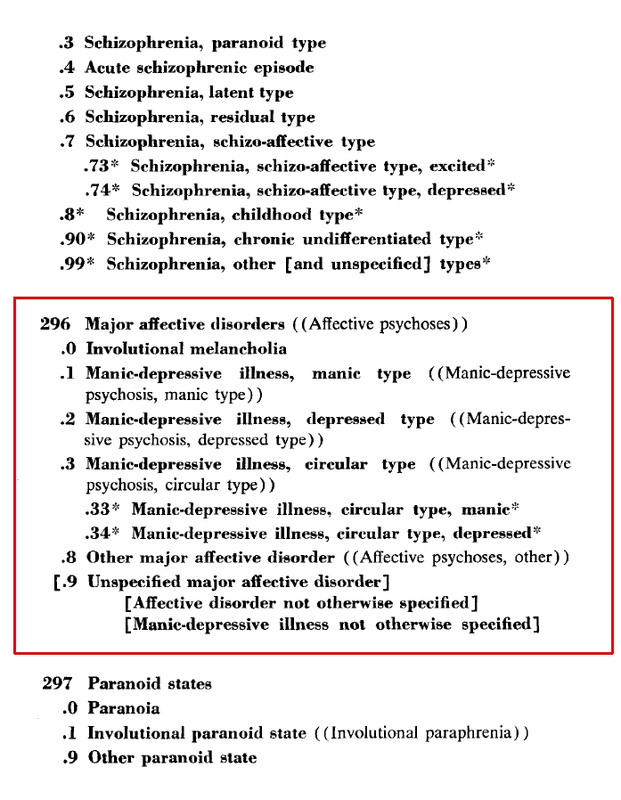 При переписывании со старой истрепавшейся обложки в новую, не нашлось лучшего места для указанной данной нумерации и потому вписали «296» в колонку МКБ-10. Хотя взята эта цифра именно из действовавшего на тот момент справочника DSM, где она уютно расположена рядом с шизофренией.